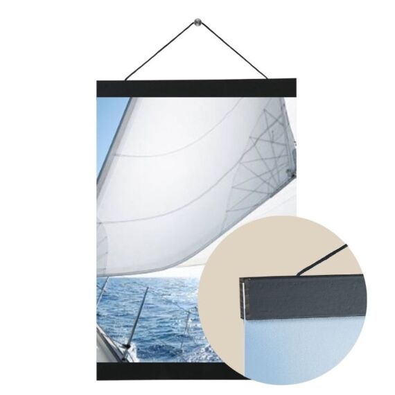 Elegante Posterleiste aus schwarzem Holz (21 cm) mit Magnetverschluss und Lederaufhängung – ideal für stilvolle Präsentationen.